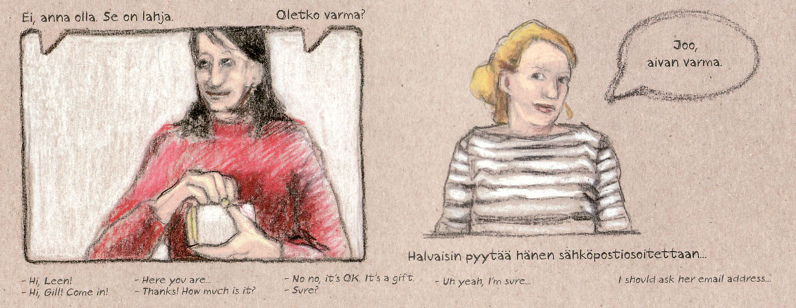 Piirrostyyli eroaa tavanomaisesta, jos tavanomaiseksi määritellään se, mitä yleensä luen. Viiva on kuin värikiidulla vedettyä, mitä se todennäköisesti onkin. Paikoitellen tämä luo summittaisen vaikutelman yksityiskohtien kadotessa ja ilmeidenkin muuttuessa viitteellisiksi. Tämä taas nostaa kuvien herättämät tunnetilat etualalle, mikä puolestaan kuljettaa tarinaa eteenpäin. Leen Van Hulst onnistuu vangitsemaan hyvin suomalaisen talvi-iltapäivän hämyn.
