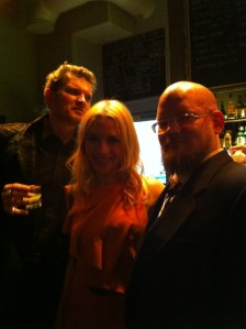 Me, Arren, Eeva and her friend Terhi took over an abandoned table pretty much as far away from the center of the action as possible. I read the piece and formulated some kind of feedback about what worked as it was and what could be tweaked to work a little better. I have no idea if it was useful at all. I can only hope. It’s the same with editing anthologies. I point out errors, do corrections and offer ideas seldom knowing if the writer sees it as a beneficial working relationship or someone bugging in with their ill-conceived opinions. After the feedback we stayed where we were and continued chatting about stuff. At one point Martin walked by and as Eeva and Terhi had been bouncing in their chairs for a chance to have a picture taken with the esteemed GOH they seized the moment. Eeva handed Arren the camera and gave instructions how to go about catching their souls inside that infernal machine. It did not go like in Strömsö. Some thingamagik that should’ve been on automatic was left on manual. On the plus side you can simulate being really drunk just by looking at the fuzzy photo.