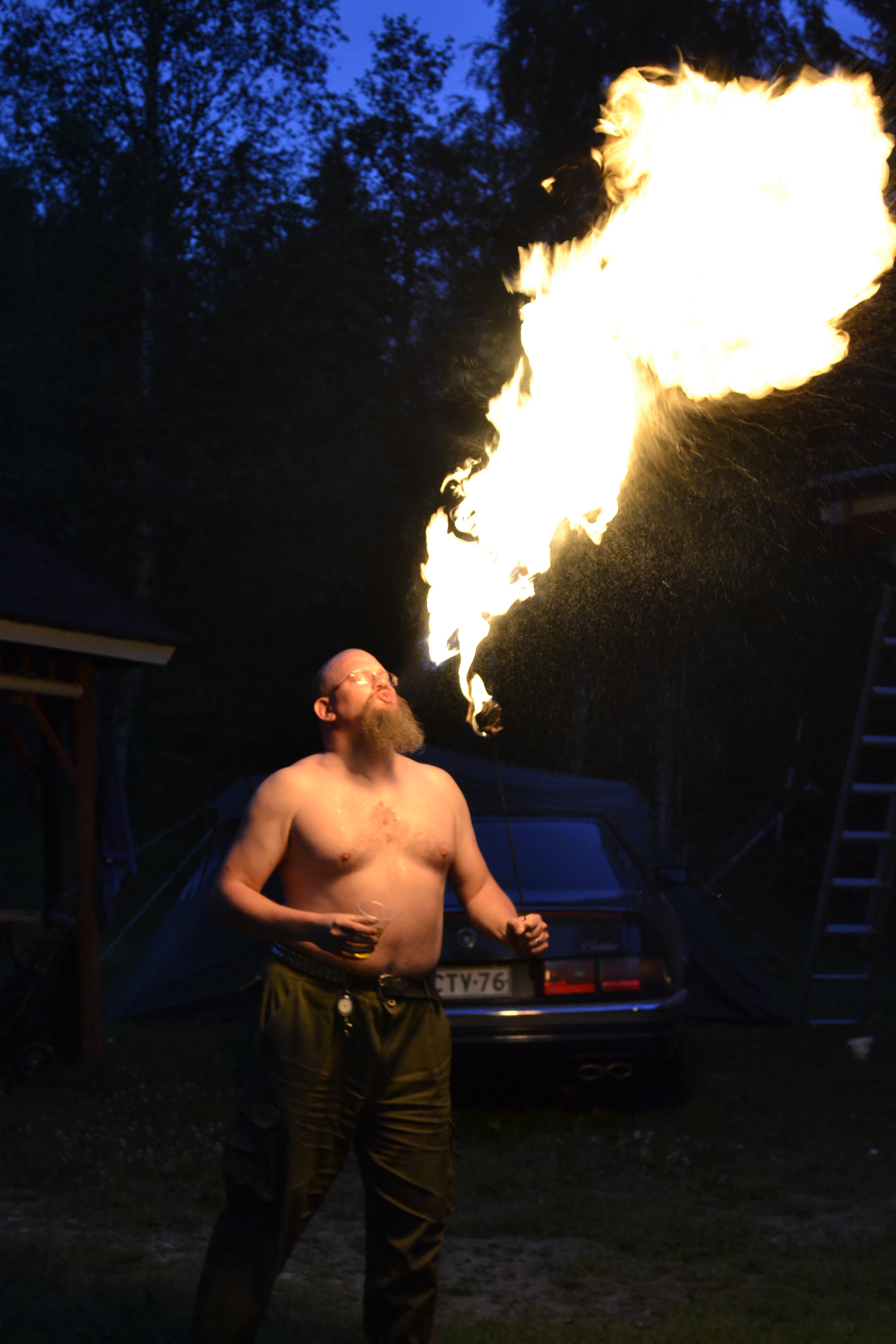 Kovin monia jänniä taitoja en voi opettaa, mutta tulenpuhallus on poikkeus. Yleisön pidätellessä jännittyneenä kollektiivista hengitystään hönkäilin lieskan toisensa jälkeen vasten tummenevaa taivasta. Reaktioista päätellen esitystä voi luonnehtia jopa näyttäväksi. Jos joku ihmettelee, miten pörheän parran kanssa voi syöstä lieskoja käräyttämättä karvojaan, jatkakaa toki ihmettelyä ja kertokaa minullekin, jos löydätte ratkaisun. Kahteen otteeseen tuli tarttui naamakarvoihin ja lieskat piti taputella sammuksiin. Lasken tämmöiset tapaturmat show-elämän luontaisiin riskeihin. Eikä se toisaalta ollut edes ensimmäinen kerta. Pari talvea sitten esiinnyin koulun tokaluokan joulujuhlan jälkeen lapsosille ja heidän vanhemmilleen. Lieskat lensivät, mutta jossain vaiheessa yleisön joukosta alkoi kuulua hivenen hätääntyneitä huudahduksia, ja huomasin, miten valon läikettä tuli tyystin toisesta paikasta kuin soihdusta. Mutta ei se ollut mitään vakavaa, viikset vain olivat syttyneet tuleen.