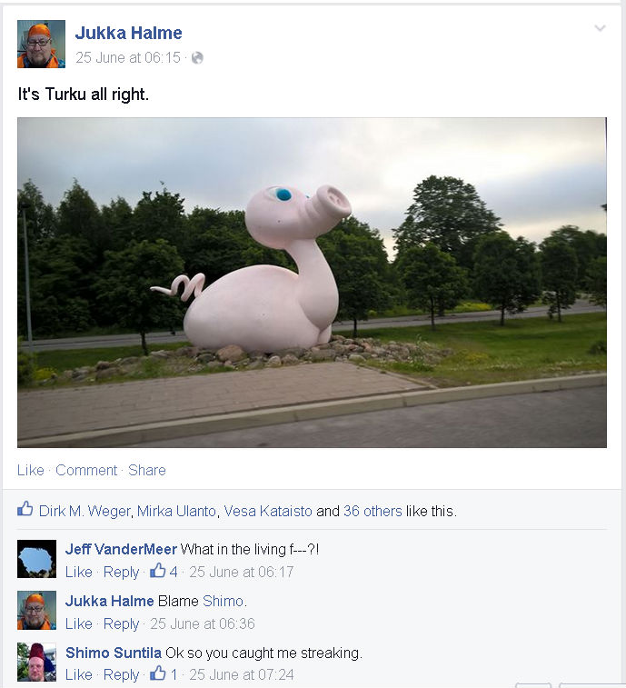 Samassa suunnitelma alkoi ottaa muotoaan. Minulla oli pyyhe, mutta kuka sanoi, että se olisi kotiin vietävä? Annen ristiksi sitä nyt ei kehtaisi jättää, mutta Tuomaksen hyvinkin, eikä mies edes ollut pihalla seuraamassa jännittävää toimitusta. Seuraavan puolen tunnin ajan vaanin tilaisuutta livauttaa rätti Tuomaksen olkalaukkuun, mutta haasteiden kasautuessa liikaa tyydyin Tuomaksen matkalaukkuun, jossa oli kannettu miljoona kiloa kirjoja. Valitettavasti operaatio suoritettiin liian aikaisin ja Tuomas ehti huomata jäynän, mutta otti autonpesun ja liki pakkauksen verran, että hän alkoi aavistella, kuka syyllinen saattoi olla. Mitään en myöntänyt silloin, joten tätä on nyt pidettävä kirjallisena tunnustuksena. Ensimmäisen källin karahdettua kiville kehitin perään vielä toisen, mutta koska siitä ei ole vielä Facebookissa minun nähdäkseni huomautettu, en aio antaa ennakkovaroitusta ja kertoa, mikä se on.