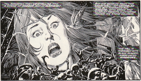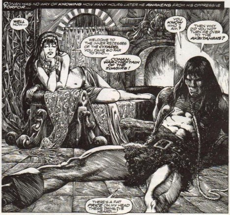 Vuonna 1970 Marvel Comics alkoi julkaista sarjakuvaa nimeltä Conan the Barbarian. Lehti oli messevä suksee ja pelisilmäisenä firmana Marvel päätti heittää kehiin toisenkin hyborisen ajan kovimman kollin edesottamuksista kertovan julkaisun. Näin syntyi 1974 käynnistynyt The Savage Sword of Conan, jossa kuvat olivat mustavalkoisia, sivukoko isompi, painomusteverta liberaalimmin ja ajoittain, joskin yllättävän harvoin, vilahti naisen tissi ilman että edessä oli hiuskiehkura. Tämä aikuisempi lähestymistapa vaikutti suoraan myös tarinallisiin elementtihin ja siksipä muistan noilta nuoruusvuosiltani lämpimämmin juuri Savage Swordin seikkailut.