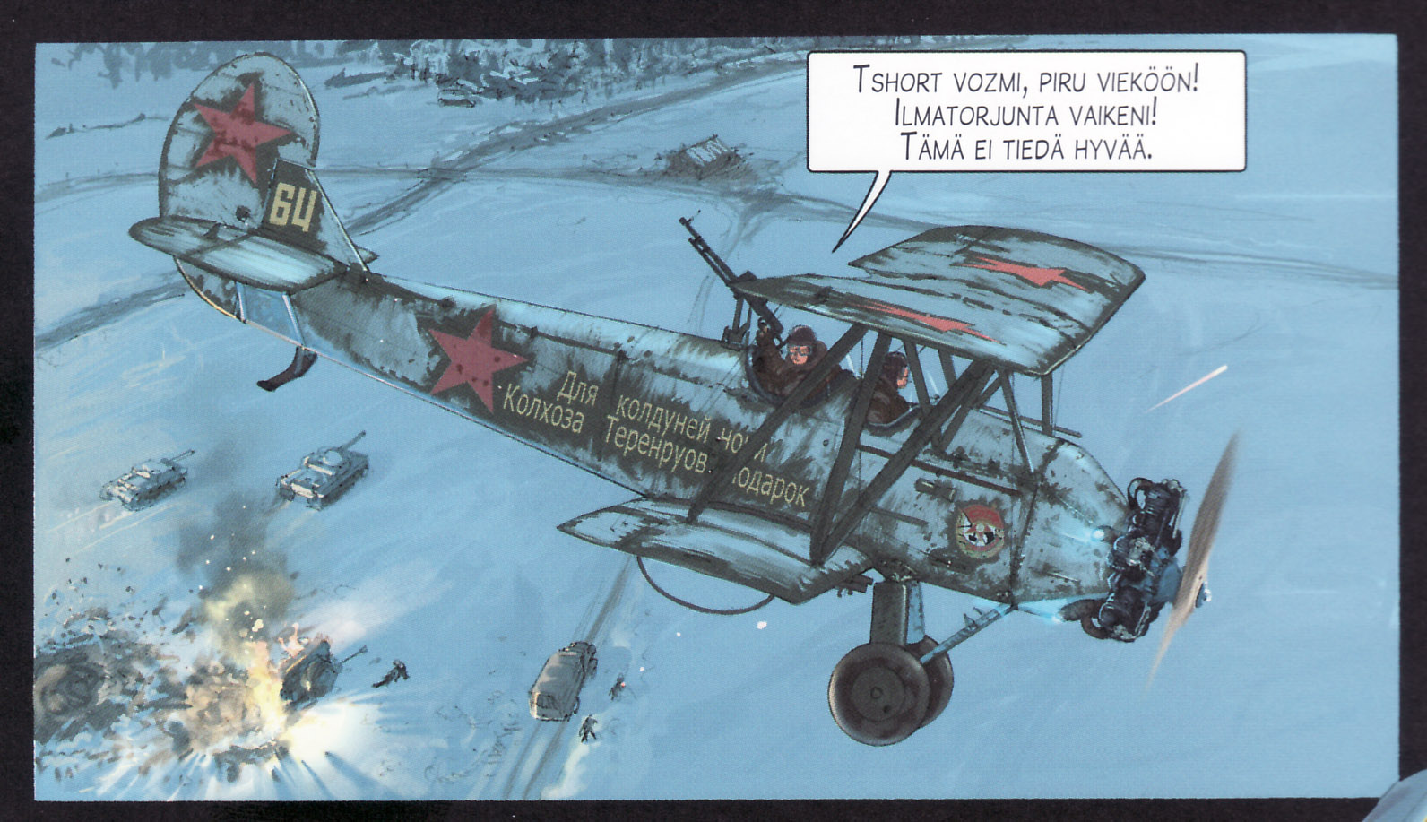 Pilvien yllä oli positiivinen yllätys ilmailusarjakuvien joukossa ja toimii jopa kaltaiselleni lentokoneista koskaan kiinnostumattomalle kuin nitroglyseriini – yksinkertaisesti ja tehokkaasti. Lisää samanlaista!