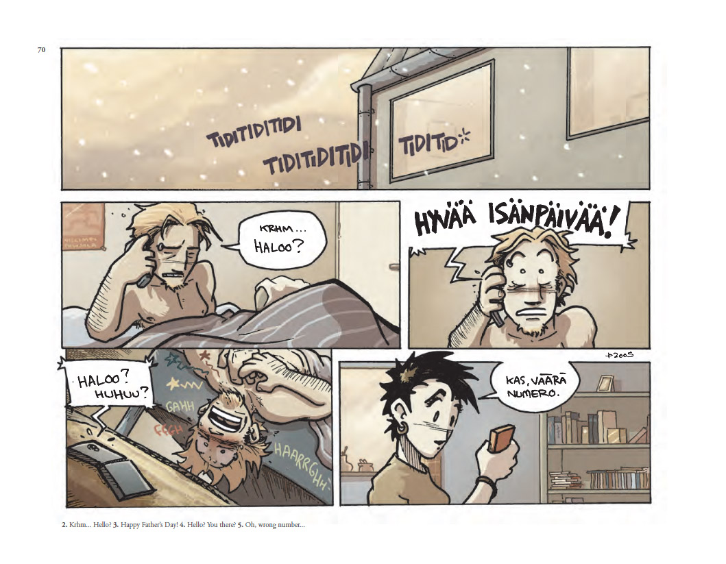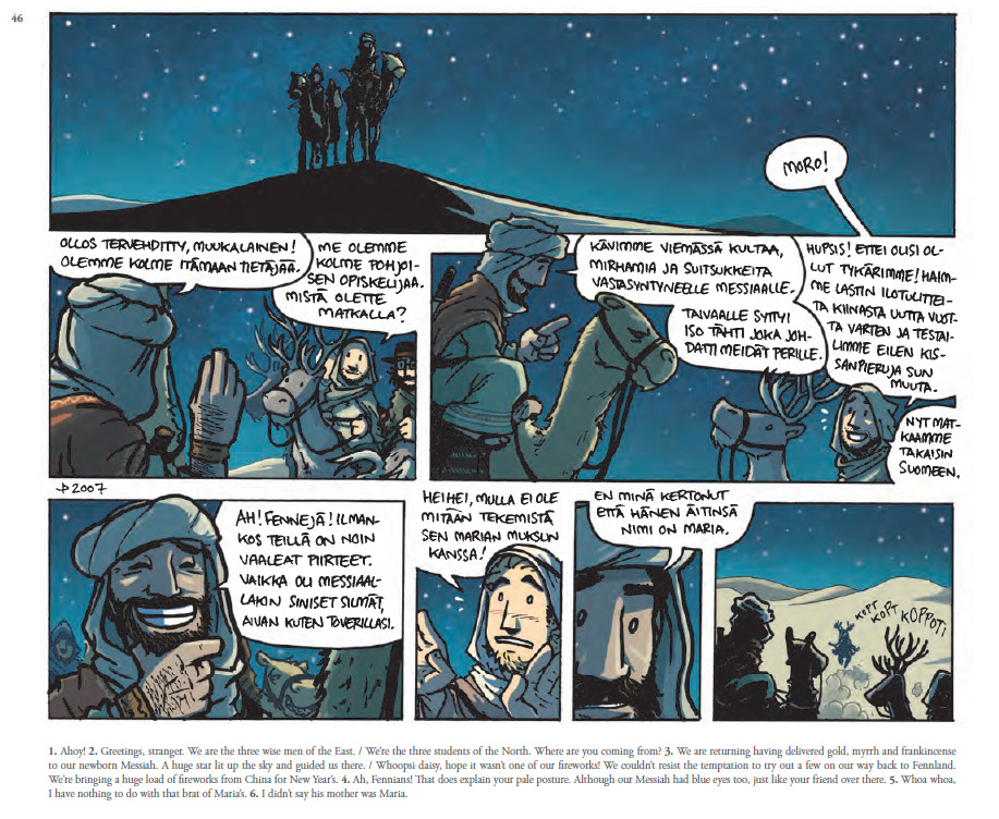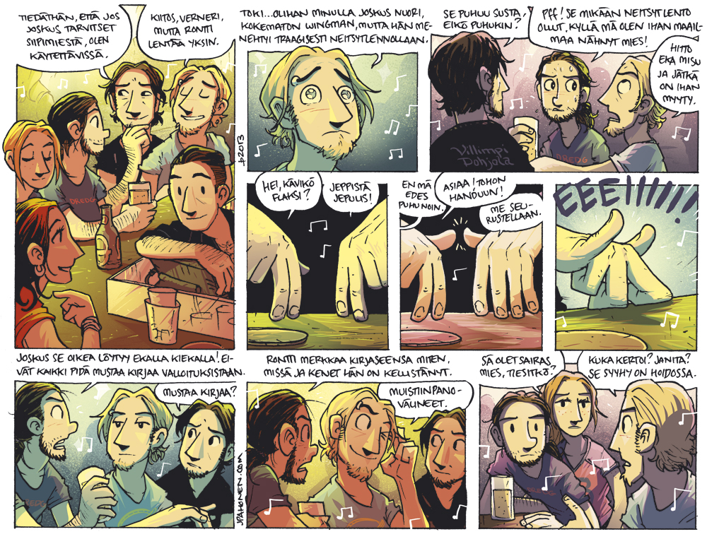 Missään vaiheessa Villimpää Pohjolaa vuosien varrella lukiessani ei ole tullut mieleenkään marmattaa piirrosjäljestä, mutta silti panin merkille viimeistellyn fiiliksen, mikä uusimman kokoelman kuvista huokuu. Viiva on harkittua ja väritys osuu nappiin. Jää olo, että Perkerosta hioessa Ahoselle on jäänyt särmävaihde silmään ja enää ei rimaa lasketa. Piirtäjän tietää onnistuneen, kun jo hahmojen ilmeet pakottavat naurun esiin. Hirnuvan naurun. Työpöydän ääressä. Kahden lukukerran jälkeen.