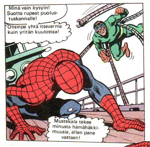 Vuosi 1982 oli seinäkiipijälle kiireistä aikaa. Musta Kissa pisti vibaa niin Peterin punttiin kuin pumppuunkin, Kingpinin jäähyväismatinea tummutti läskiä oikein olan takaa ja May-täti yritti potkaista tyhjää, mutta huti tuli jälleen kerran. Tieteen pitäisi selvittää mistä ihmemateriaalista tuo sitkeä luukasa on tehty ja lahjoittaa ihmiskunnalle kuolemattomuuden kaava. Kaikkiaan tahti oli kiihkeä ja kiivas, sillä tuohon yhteen kierrokseen auringon ympäri mahtui myös Mysterio, Tuomari, Mustekala, Dazzler joka kulki nimellä Säihky, Kraven, Mesmero sekä J. Jonah Jamesonin kertakaikkisen täydellinen kajahtaminen.