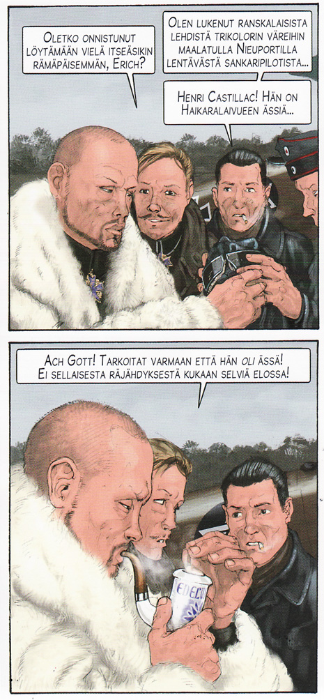 Vaikka Huuhkaja-sarjan kirjoittanut Yann osaa hänkin heiluttaa kynää, on Régis Hautière tämän yhden albumin perusteella omaa luokkaansa. Hahmot tuntuvat aidoilta ja on mukavaa vaihtelua lentää pilvien yllä ilman ympärillä riehuvaa sotaa. Sitä kyllä saattaa olla luvassa seuraavassa osassa, jonka nimi on Taistelut, mutta ainakin tarinan keskiöön joutuvilla on valmiiksi tiedossa oleva yhteinen historia, jota vasten rakentaa draamaa.